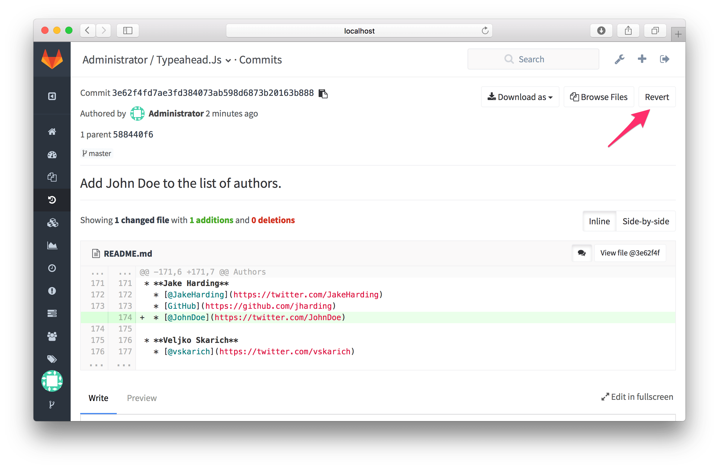 GitLab implements Git's powerful feature to revert any commit with introducing a Revert button in Merge Requests and commit details.